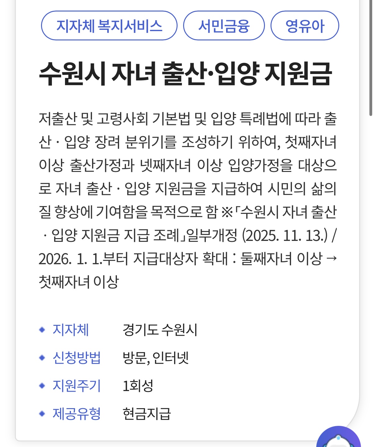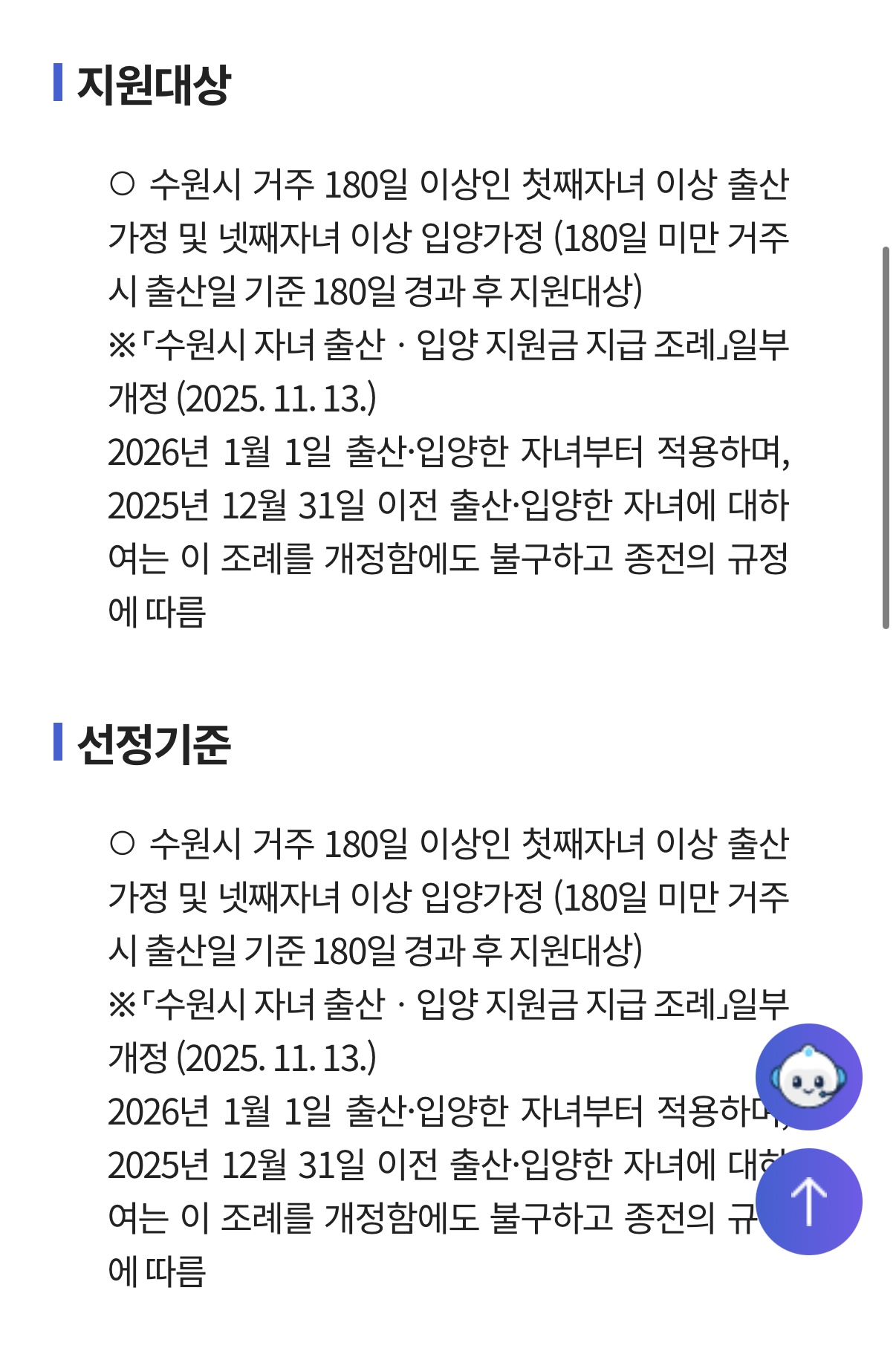 ✔ 수원시 주민등록이 되어 있고, 출생(또는 입양) 후 일정 기간 거주 요건 등을 충족해야 합니다.